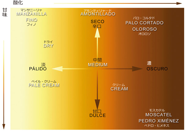 使用されるぶどう品種、醸造方法、熟成方法によって、異なったタイプのワインになります。シェリーには色、香り、味わい、料理との合わせ方に大変広い幅があります。非常に独特な製造法と熟成法そして長い豊かな歴史を背景にし、大変多様な要素を持ったこのワインにとってシェリーという総合名詞は、共通のアイデンティティを示す印になっています。