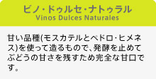 モスカテルという品種のブドウを天日干ししたものから造るビノ・ドゥルセ・ナトゥラル。濃いマホガニー色、マスカット独特の香りで、フローラルさや柑橘系の香りもあり、大変甘いが、フレッシュさと軽やかさを備えている。